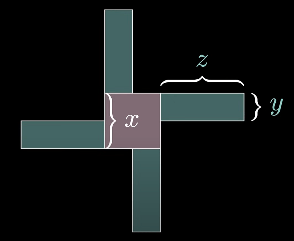 The form p = x2 + y2 is first substituted for p = x2 + yz; in doing so, we’ll need to further prove that y = z exists and satisfies the condition for each case. Though this may seem like an overcomplication, it allows us to establish this beautiful proof—using a windmill-like structure: