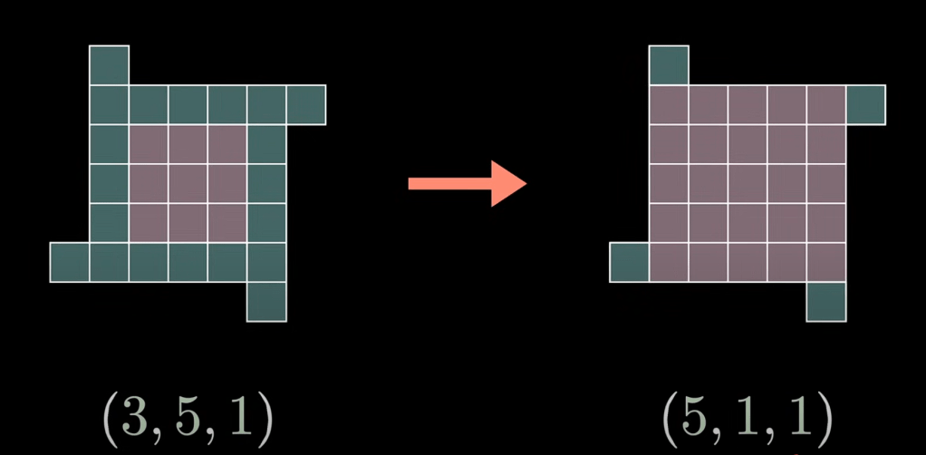 The windmill is transformed by increasing x to expand to a larger central square. Though x and y have been changed, the total area is the same; henceforth, both windmills still satisfy the equation and belong in the set Wn. This process can also be reversed, where the arms and extended, thereby shrinking the central square: