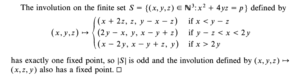 Over many centuries, many mathematicians have attempted to prove this theorem: the earliest proof (1752) was published by Euler using concepts of infinite descent; then came Lagrange, and his proof (in 1775) founded on the study of quadratic forms; Dedekind used gaussian integers, and Minkowski’s proof employed convex sets. In 1990, Zagier, simplifying Heath-Brown’s proof, presenting it in one sentence. Here is Zagier’s proof: